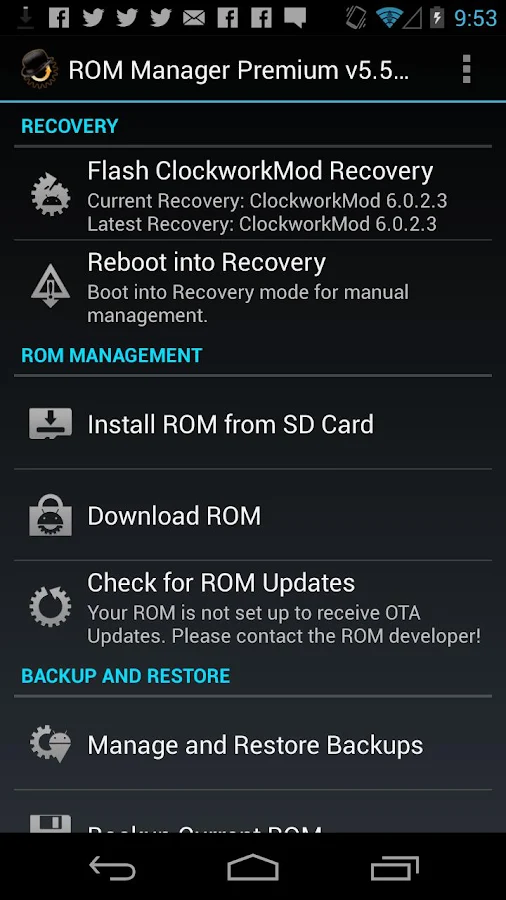 Install every Rom you want, more easier now with this great app. You can even download ROM`s from the Internet.