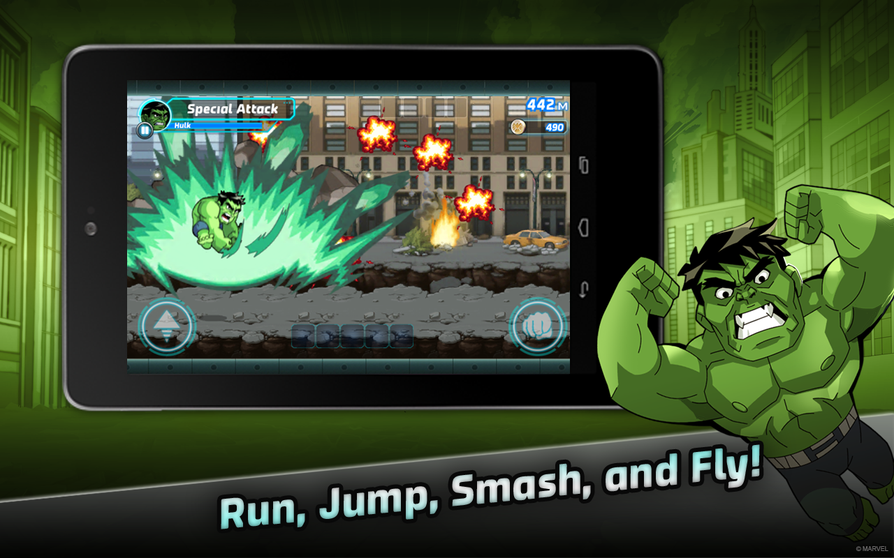 Marvel Run Jump Smash Gameplay Android & ios HD Dodge obstacles and fight Super Villains to progress as far as you can. Increase your score by switching between characters and activating each Super Hero’s unique Special Attack. Collect coins on your run and then buy special power-ups to boost your distance and score. Advance through multiple environments, compete with friends and upgrade your character!” the game description published in the store reads. Marvel Run Jump Smash!Gameplay